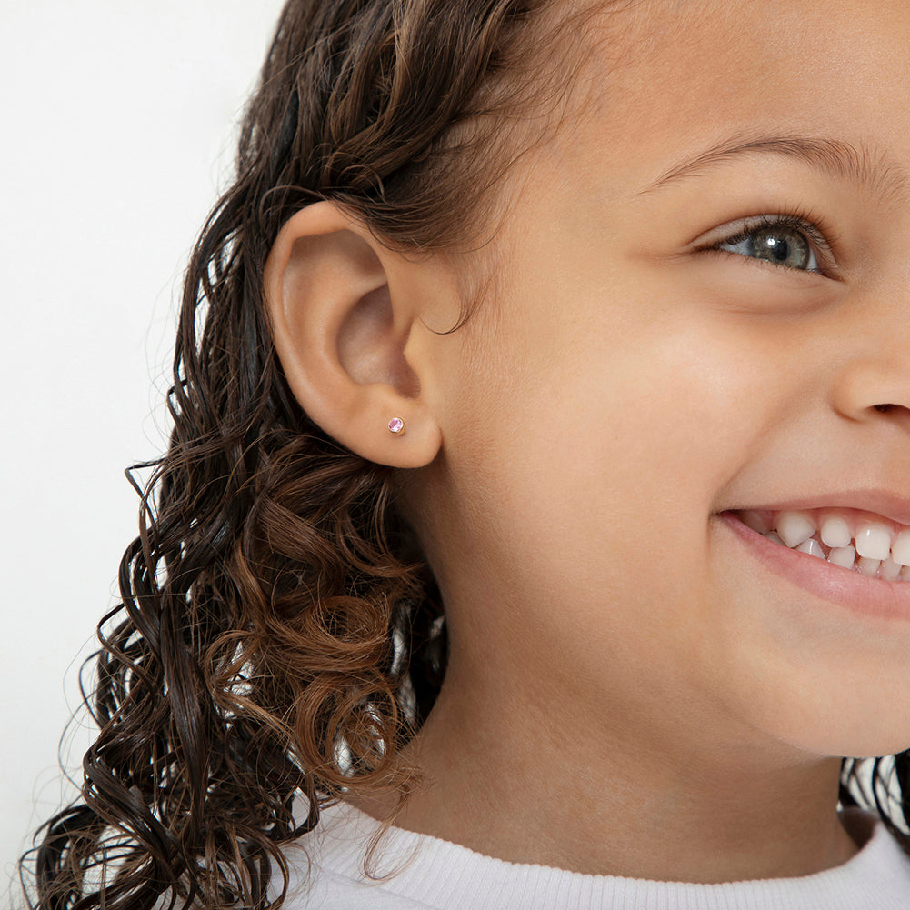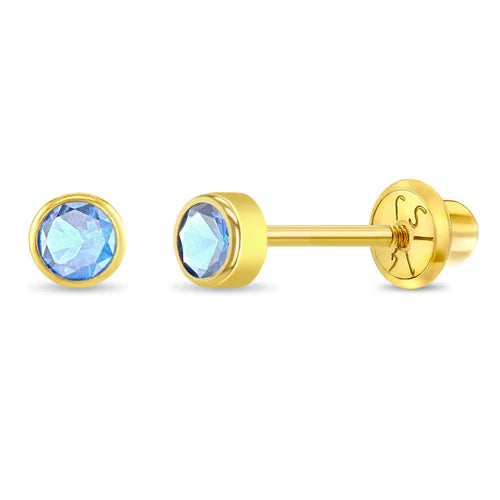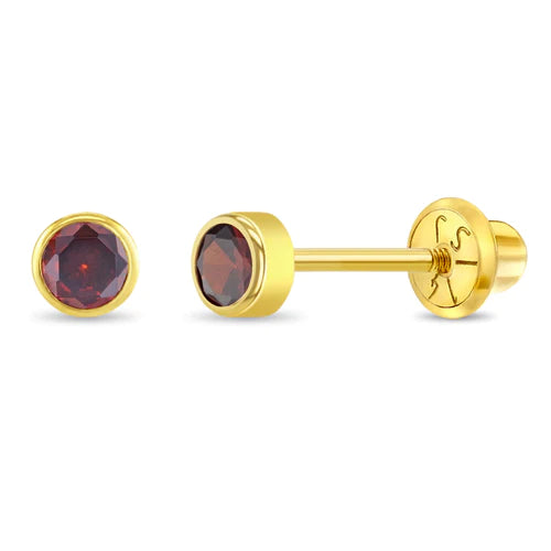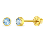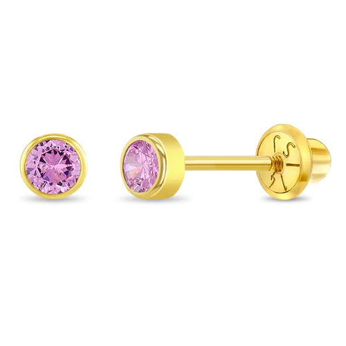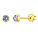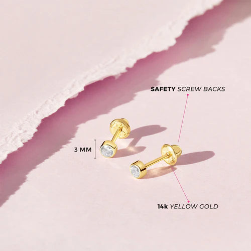 14k Yellow Gold Tiny Bezel Birthstone CZ Kids earrings with screw backing.
