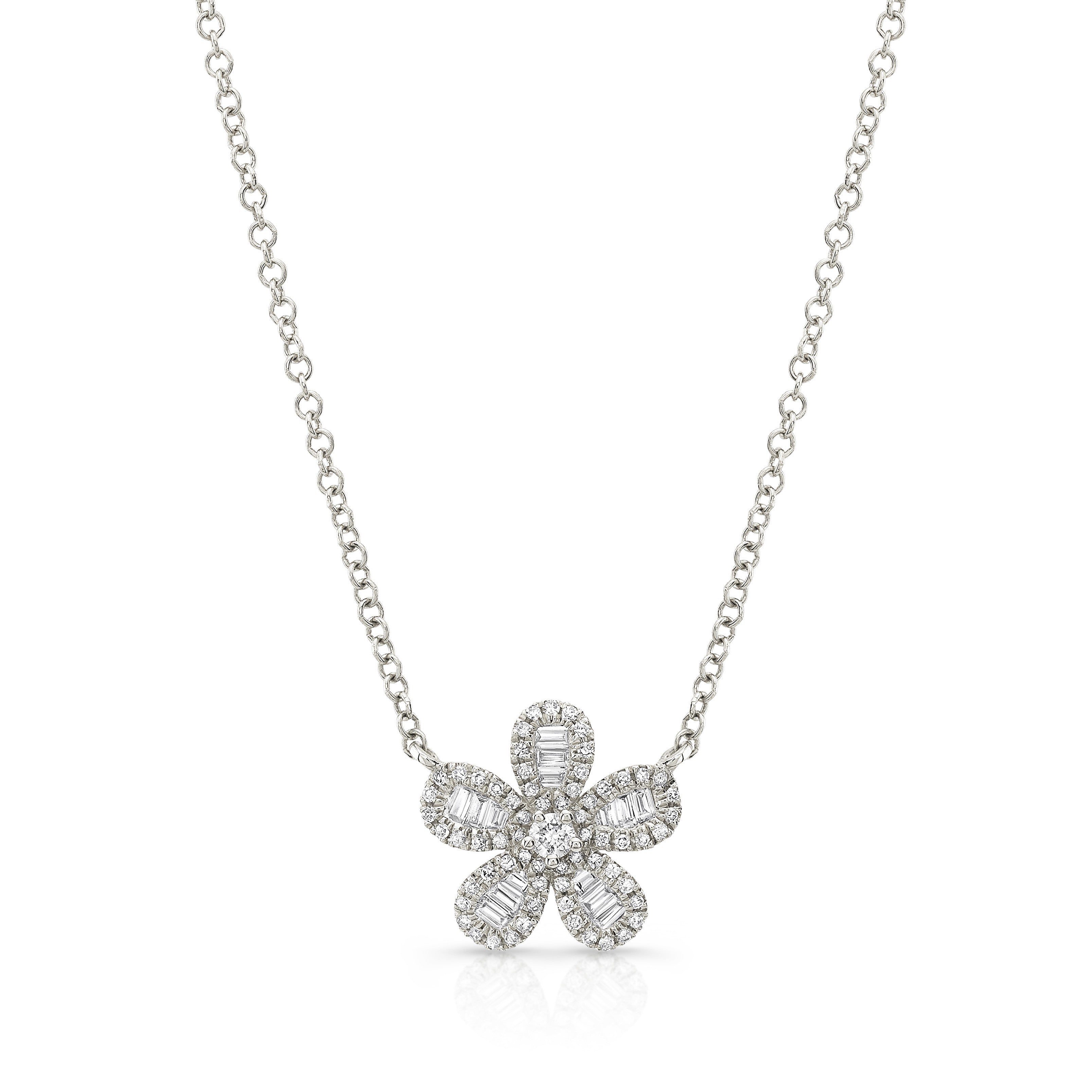 This diamond Baguette flower necklace (0.32TW) is available in 14K White, Yellow, and Rose Gold. This design comes with an 18″ chain, which can be made adjustable.