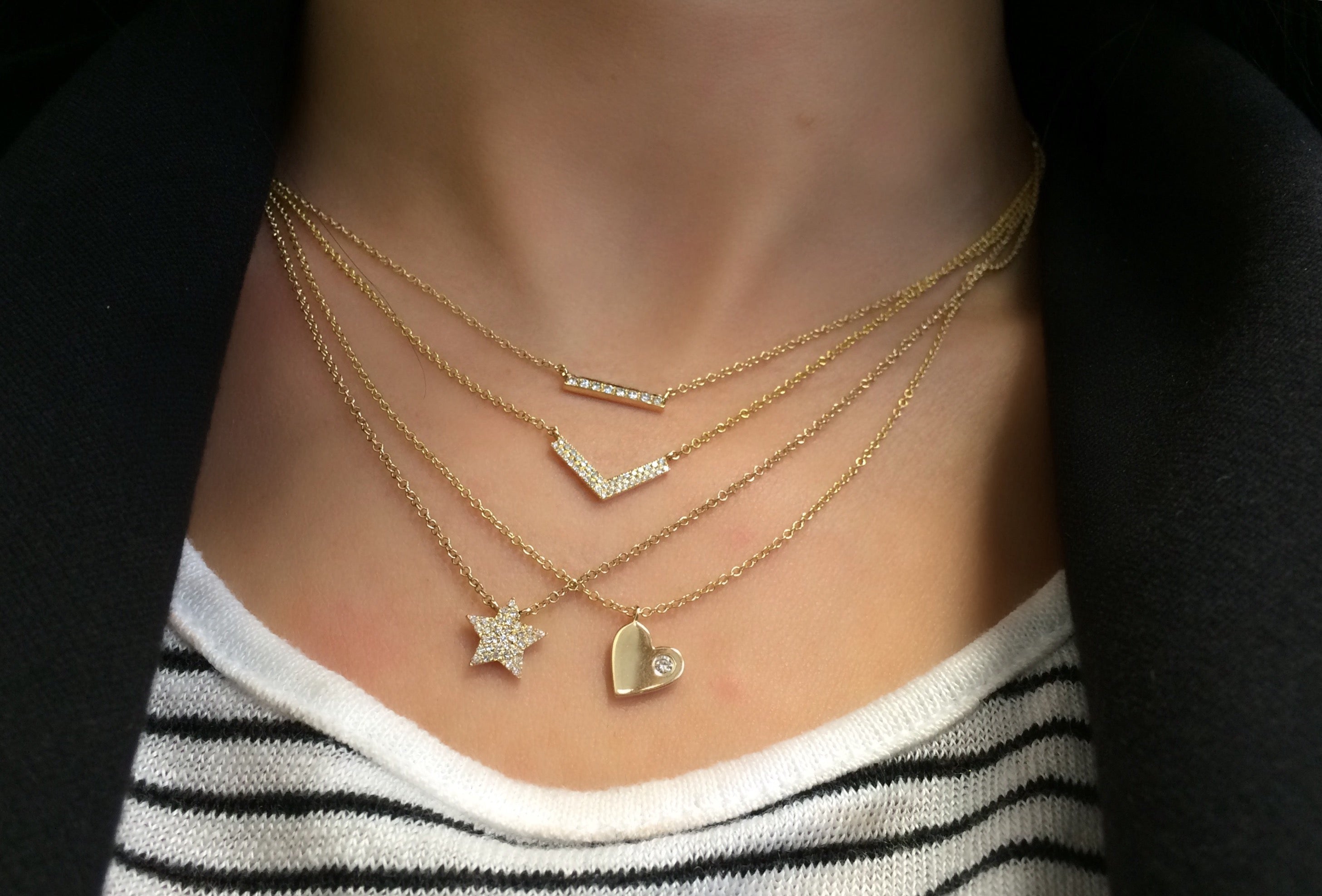 This Diamond Pave Star Necklace is available in 14K White, Yellow, and Rose Gold. This design comes with an 18″ chain, which can be made adjustable. This necklace looks amazing layered!