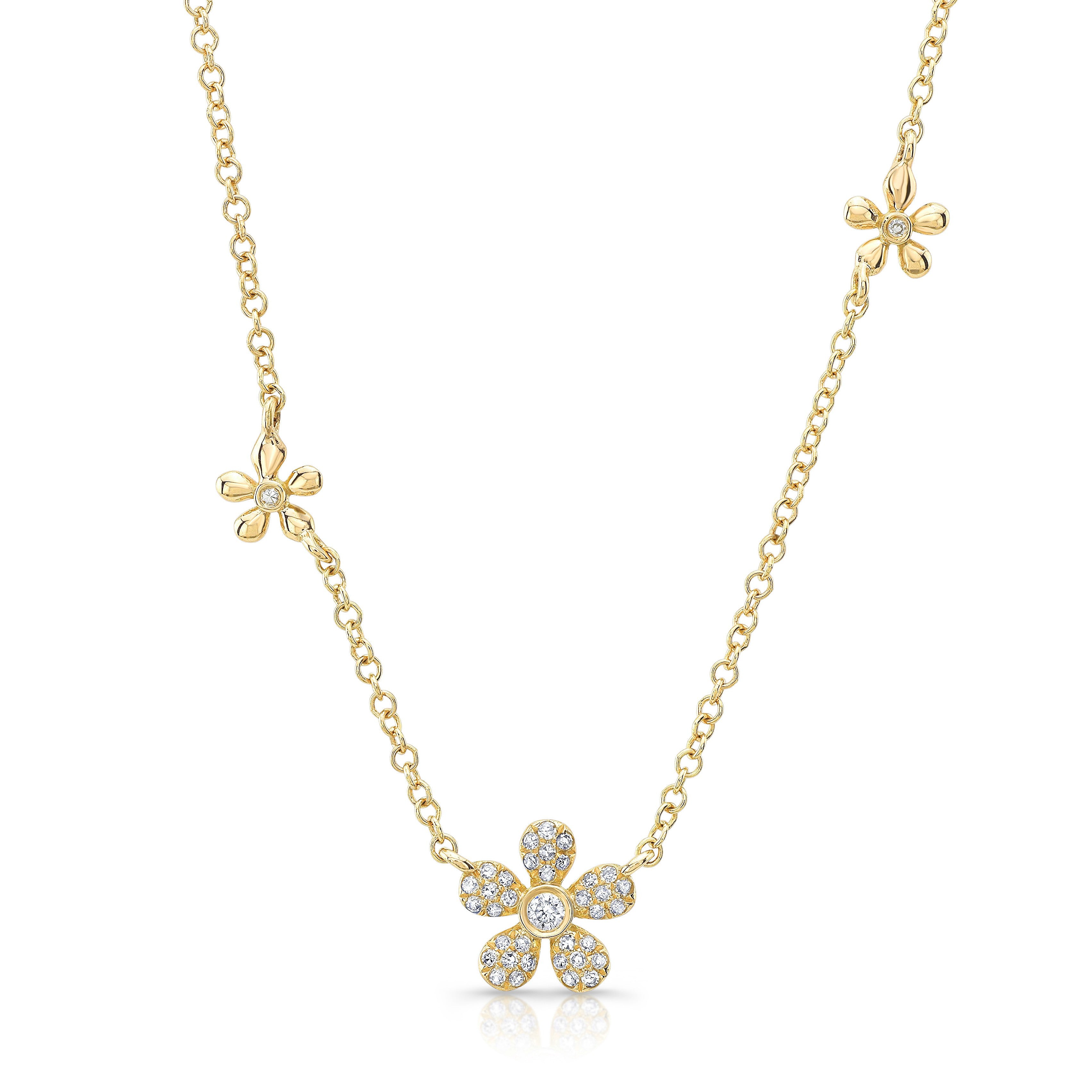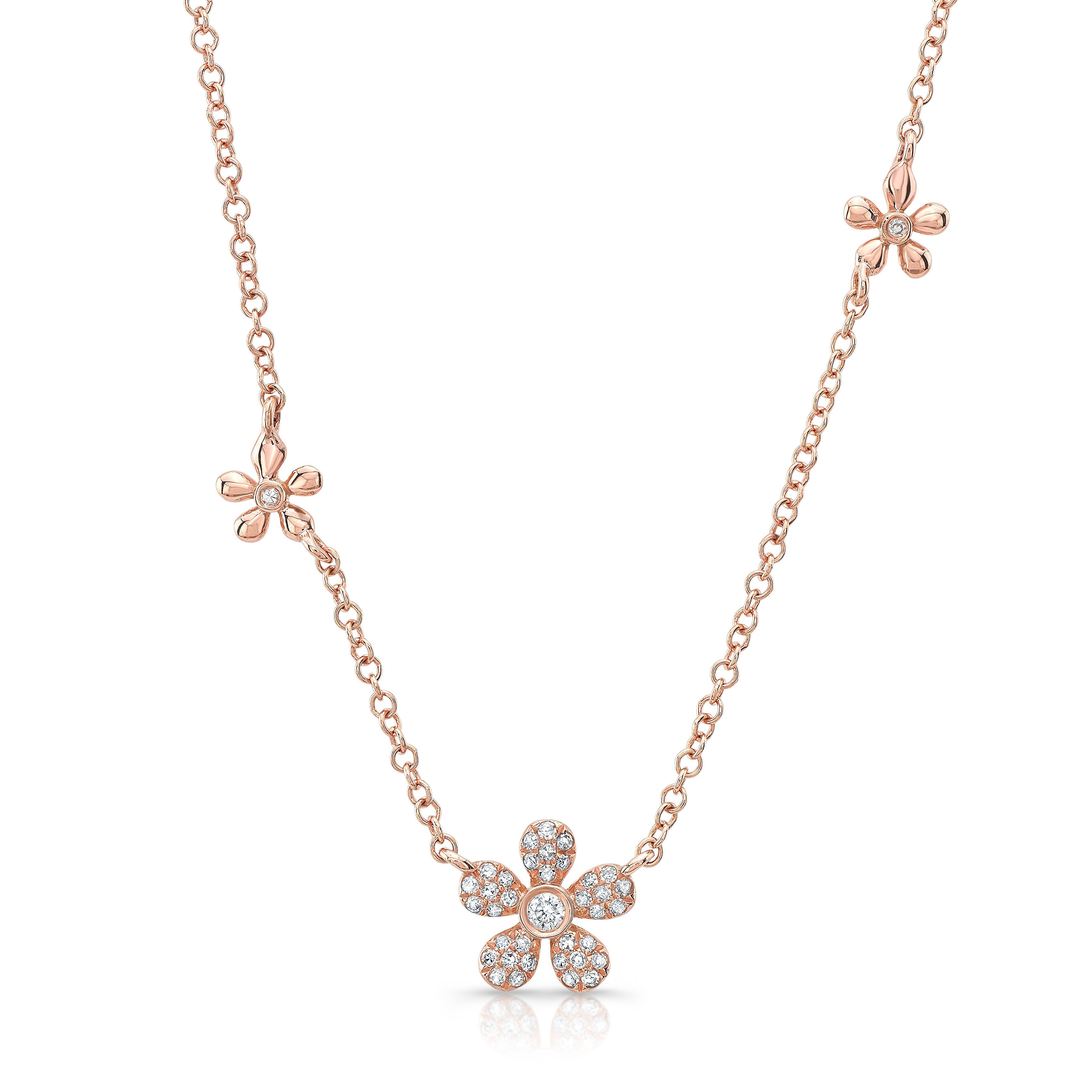 This Diamond Flower Station necklace is available in 14K White, Yellow, and Rose Gold. This design comes with an 18″ chain, which can be made adjustable.