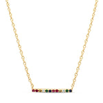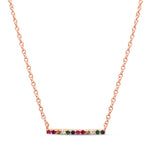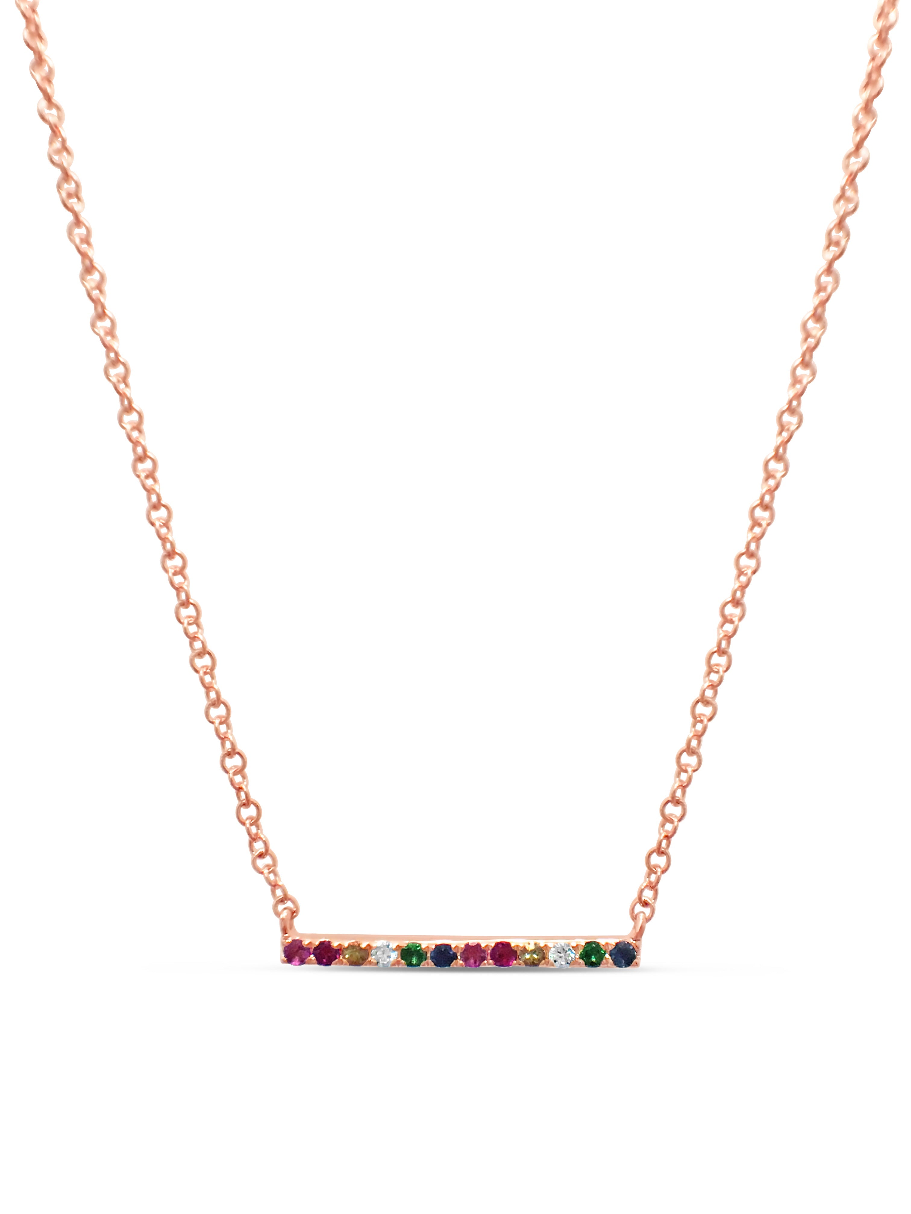 This Rainbow Sapphire & Diamond Bar Necklace (0.08ct.tw saph, .01ct.tw diam) is available in 14K Rose, Yellow, and White. This design comes with an 18″ chain, which can be made adjustable to 17" and 16"
