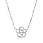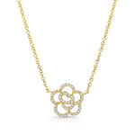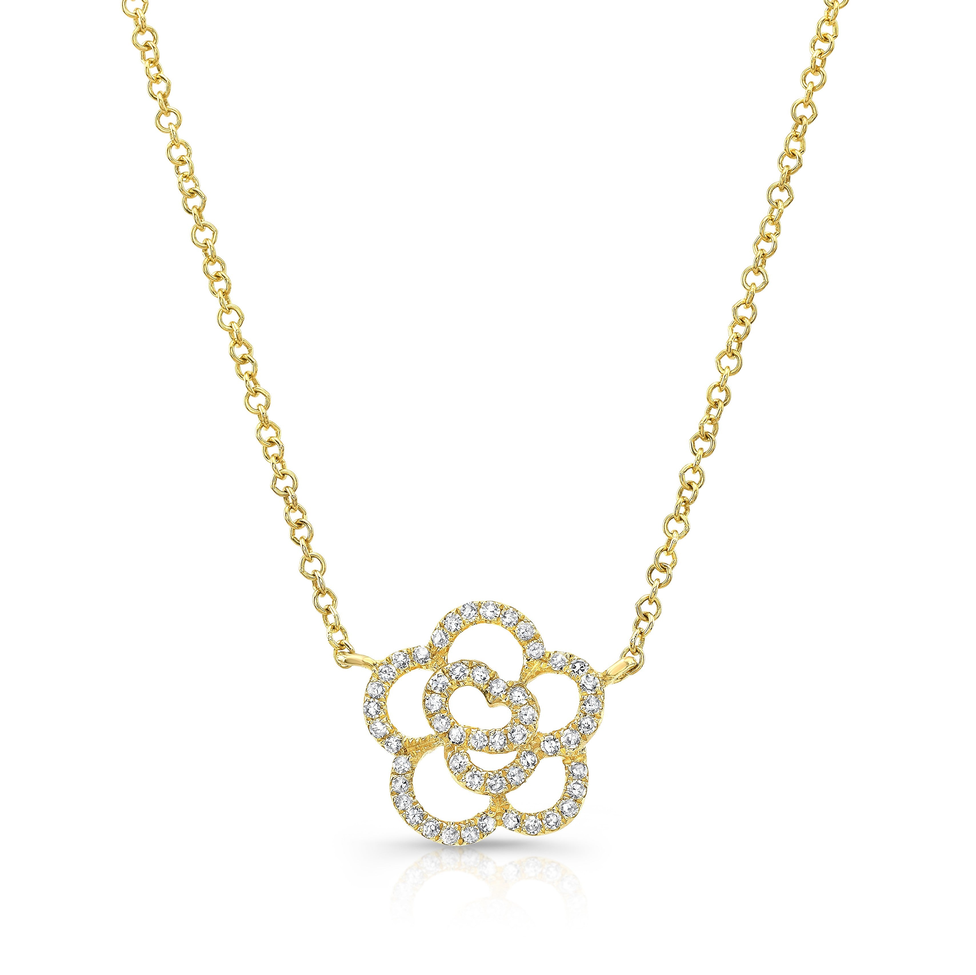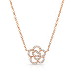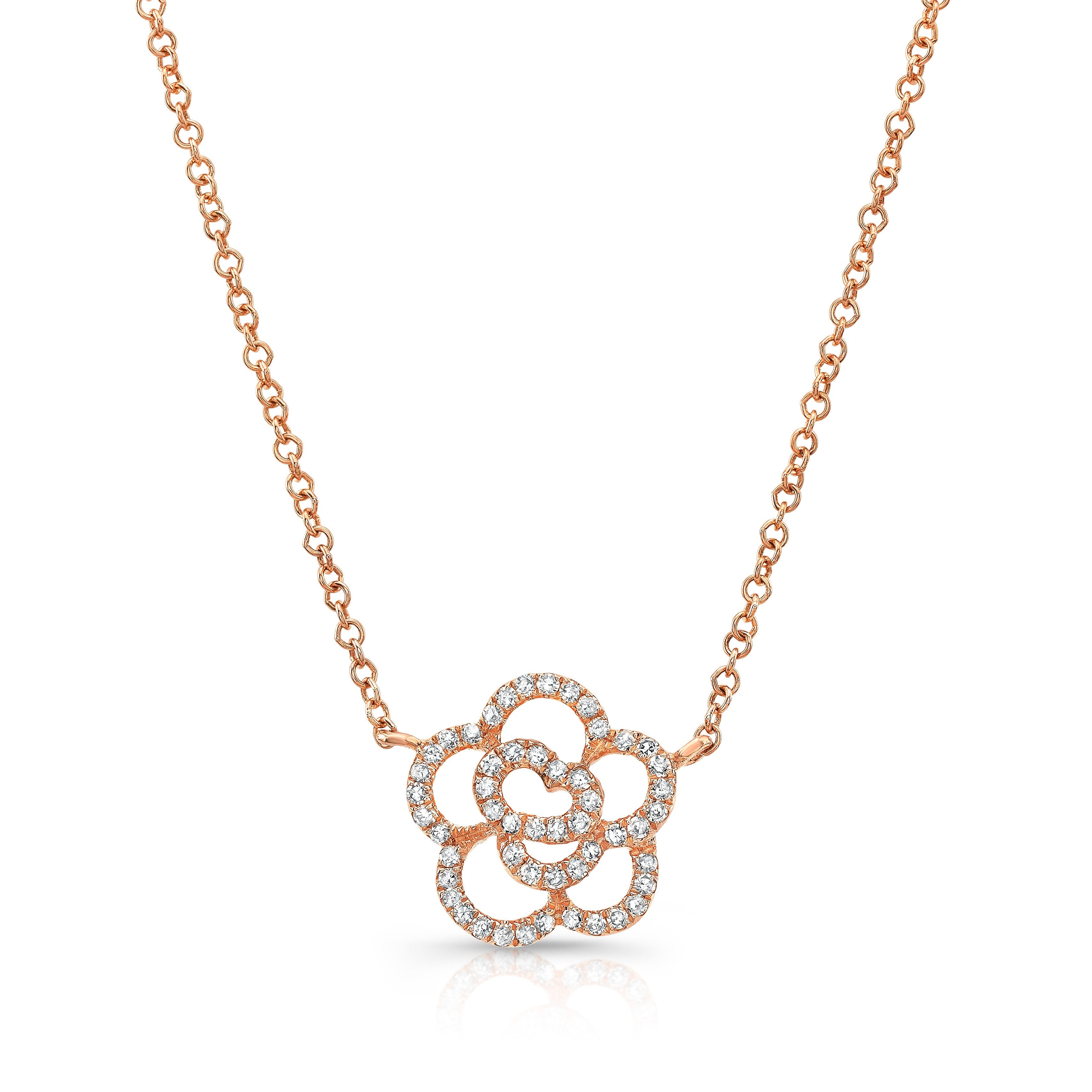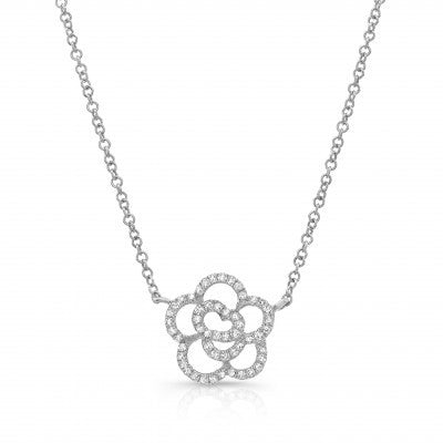 This Rosette Diamond necklace is available in 14K White, Yellow, and Rose Gold. This design comes with an 18″ chain, which can be made adjustable.