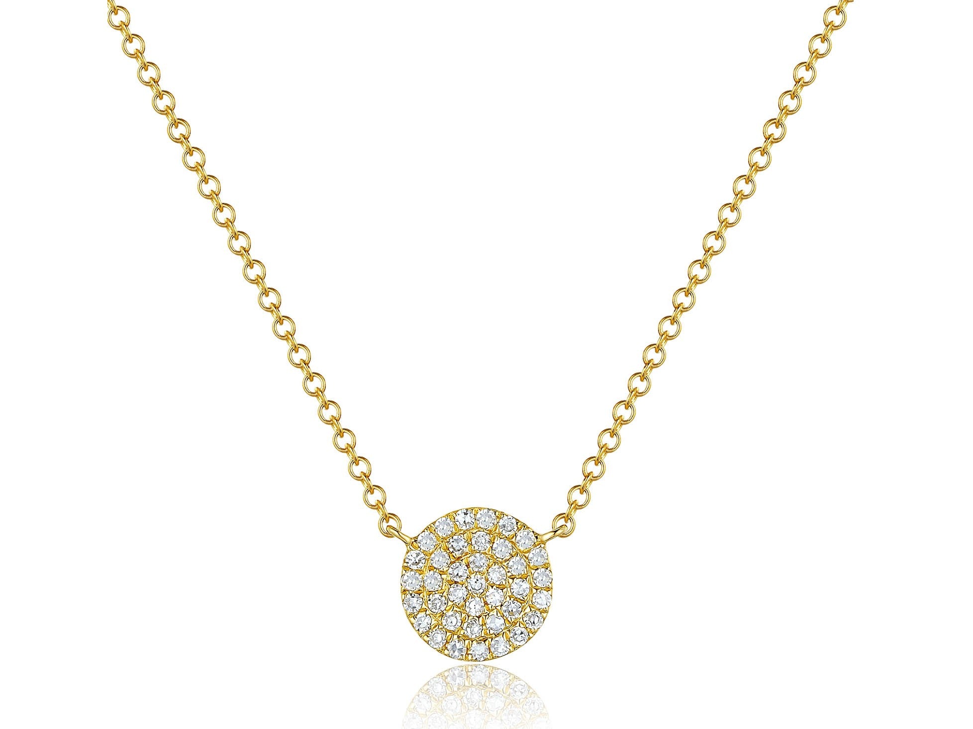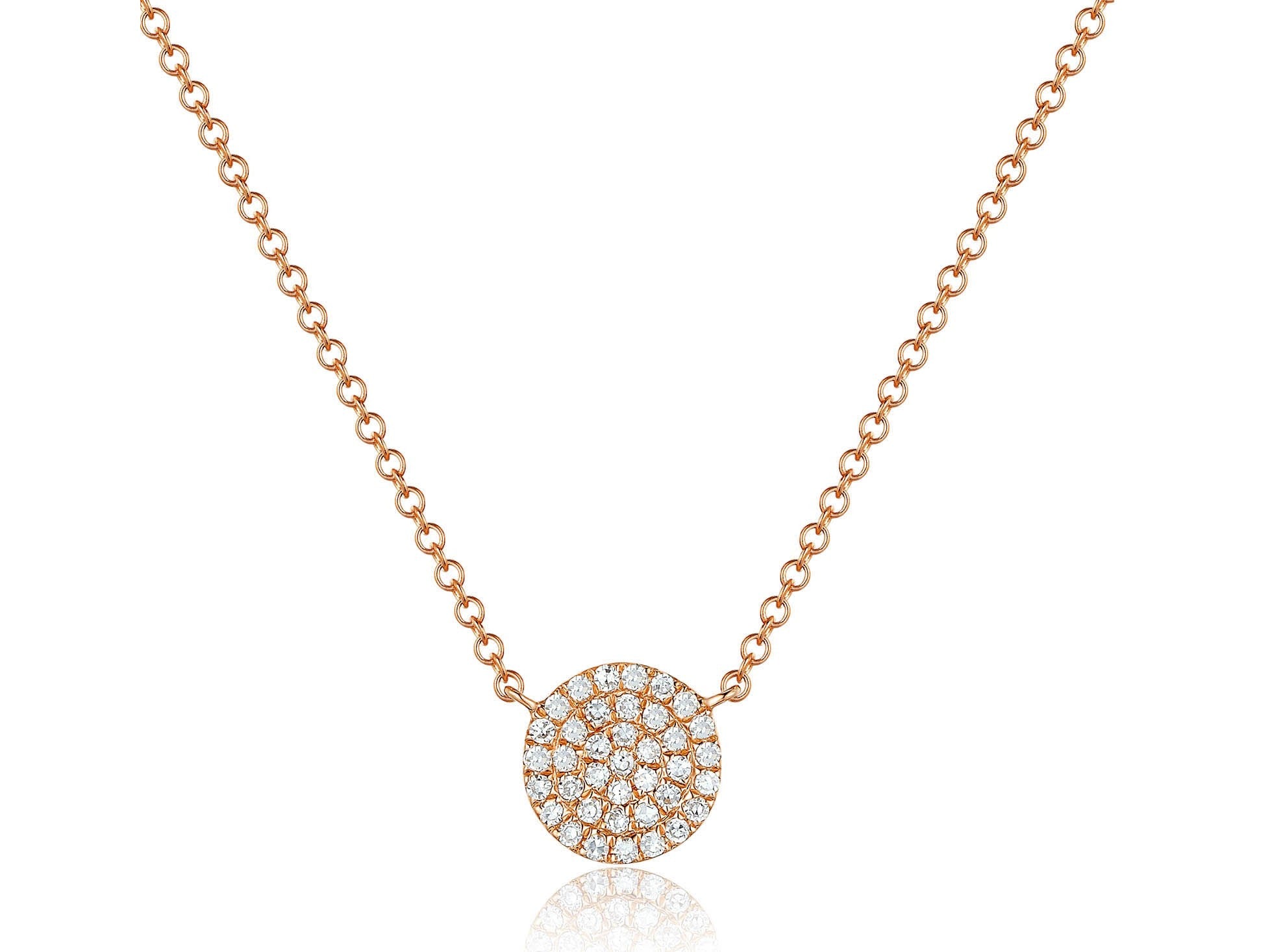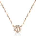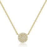 This Small Pave Diamond Disc necklace is available in 14K White, Yellow, and Rose Gold. This design comes with an 18″ chain, which can be made adjustable.