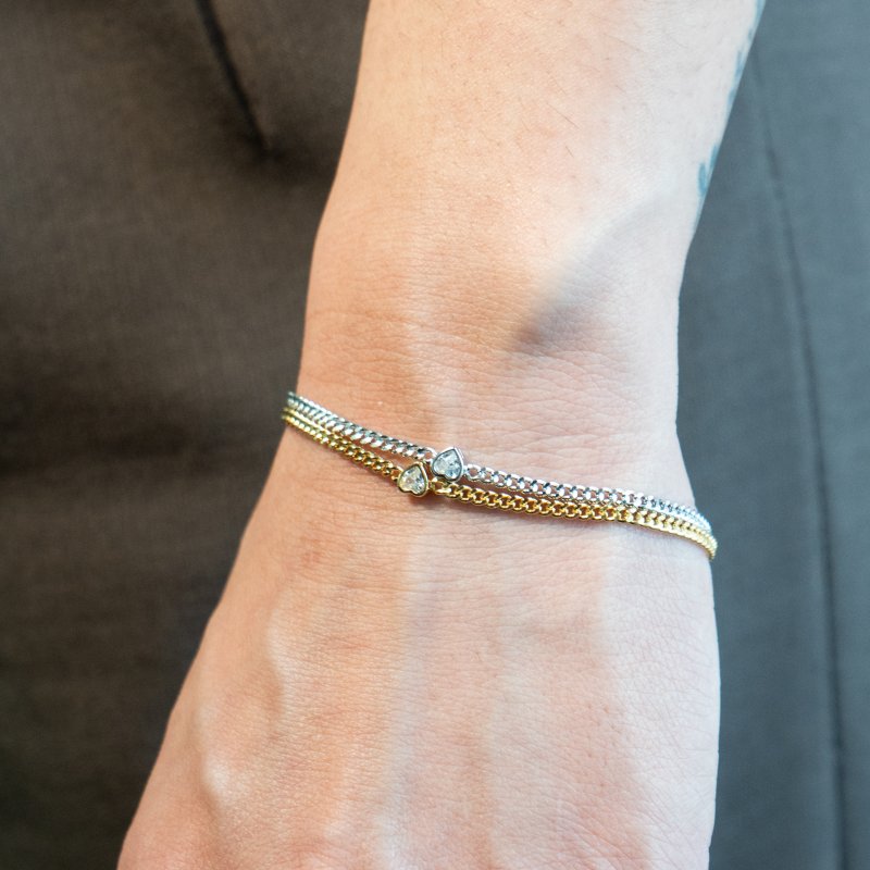This Sterling Silver Solitaire Bezel Set Heart CZ Curb Chain Bracelet is available to order in sterling silver white or yellow gold plated.