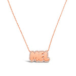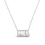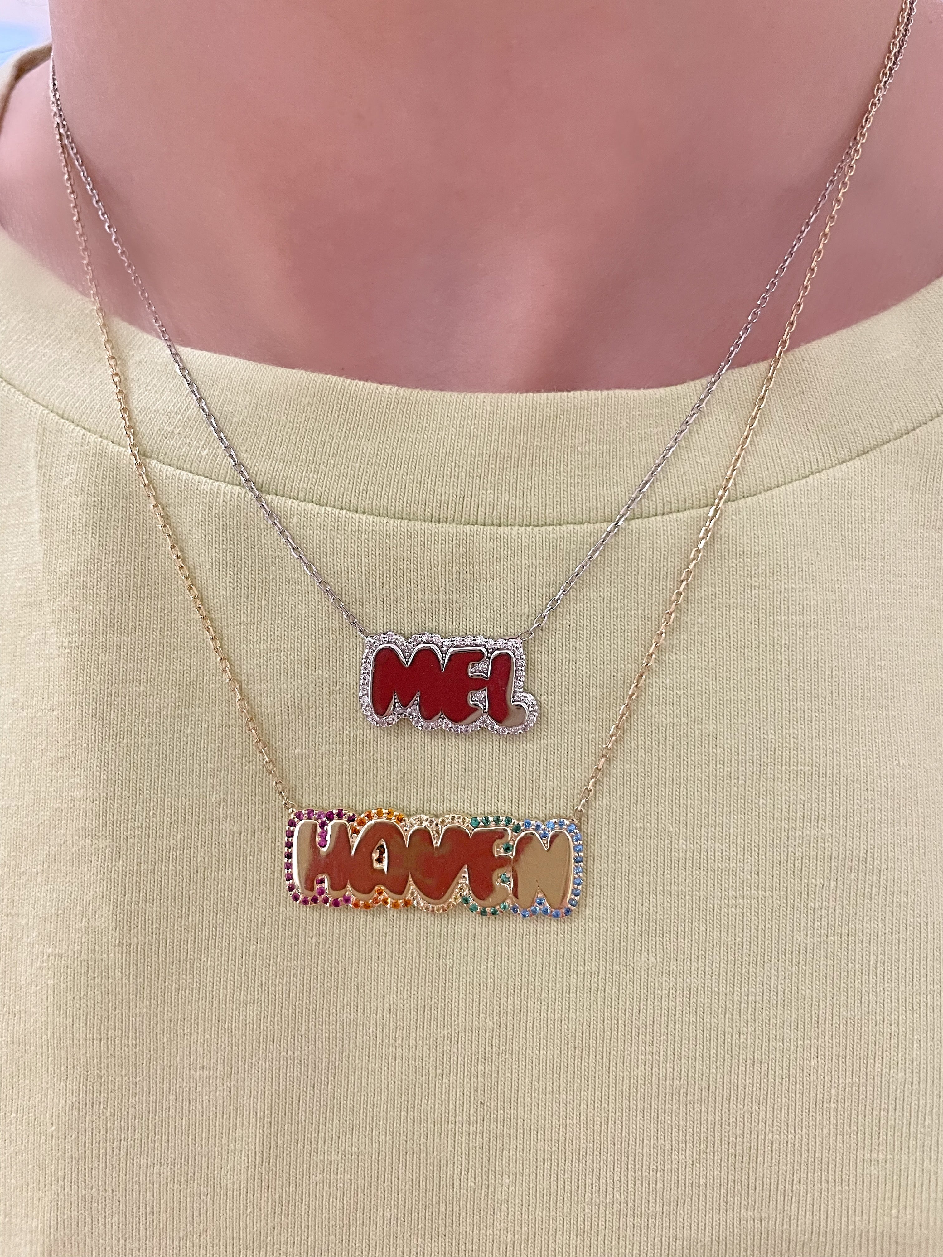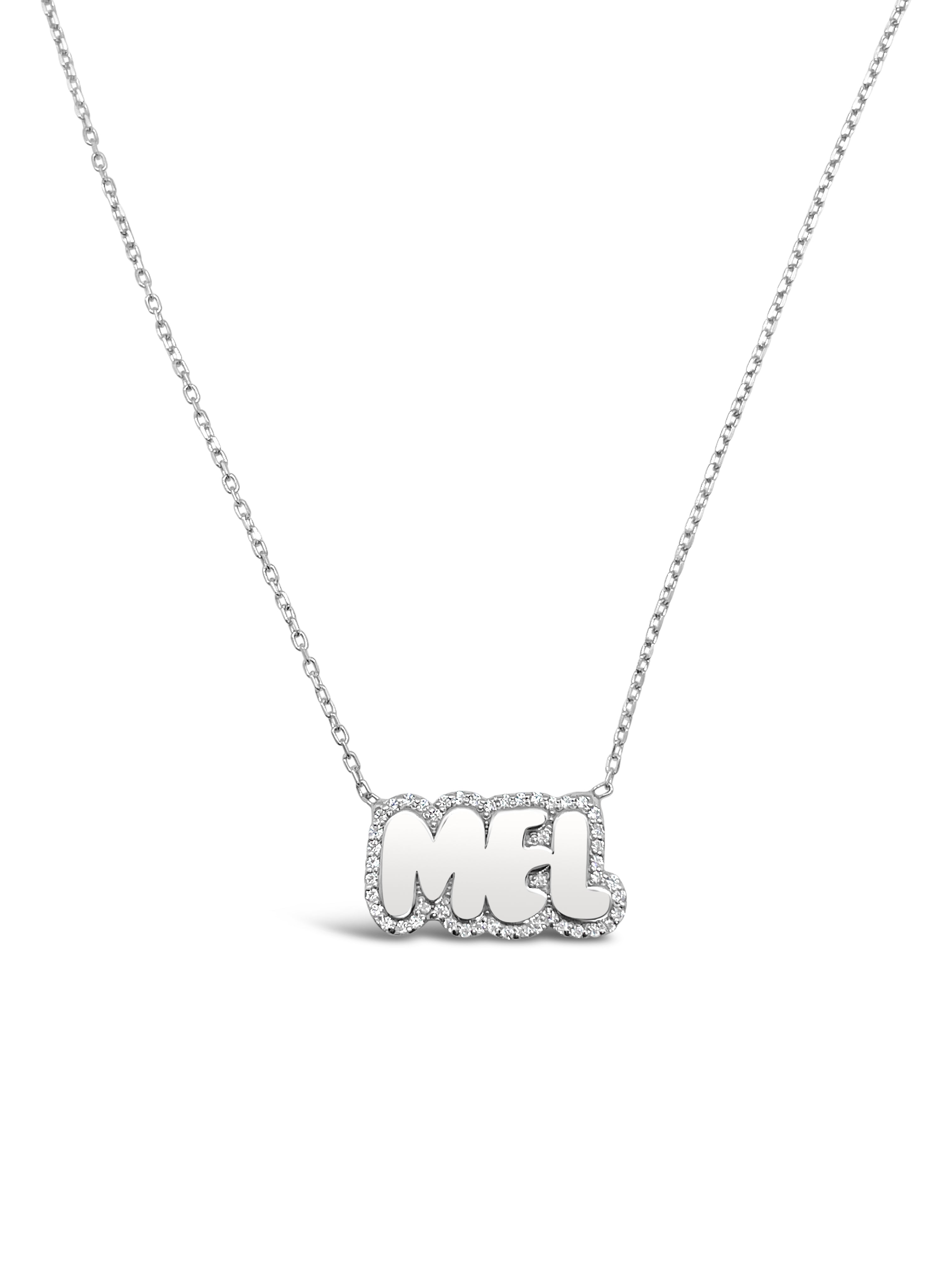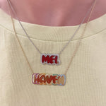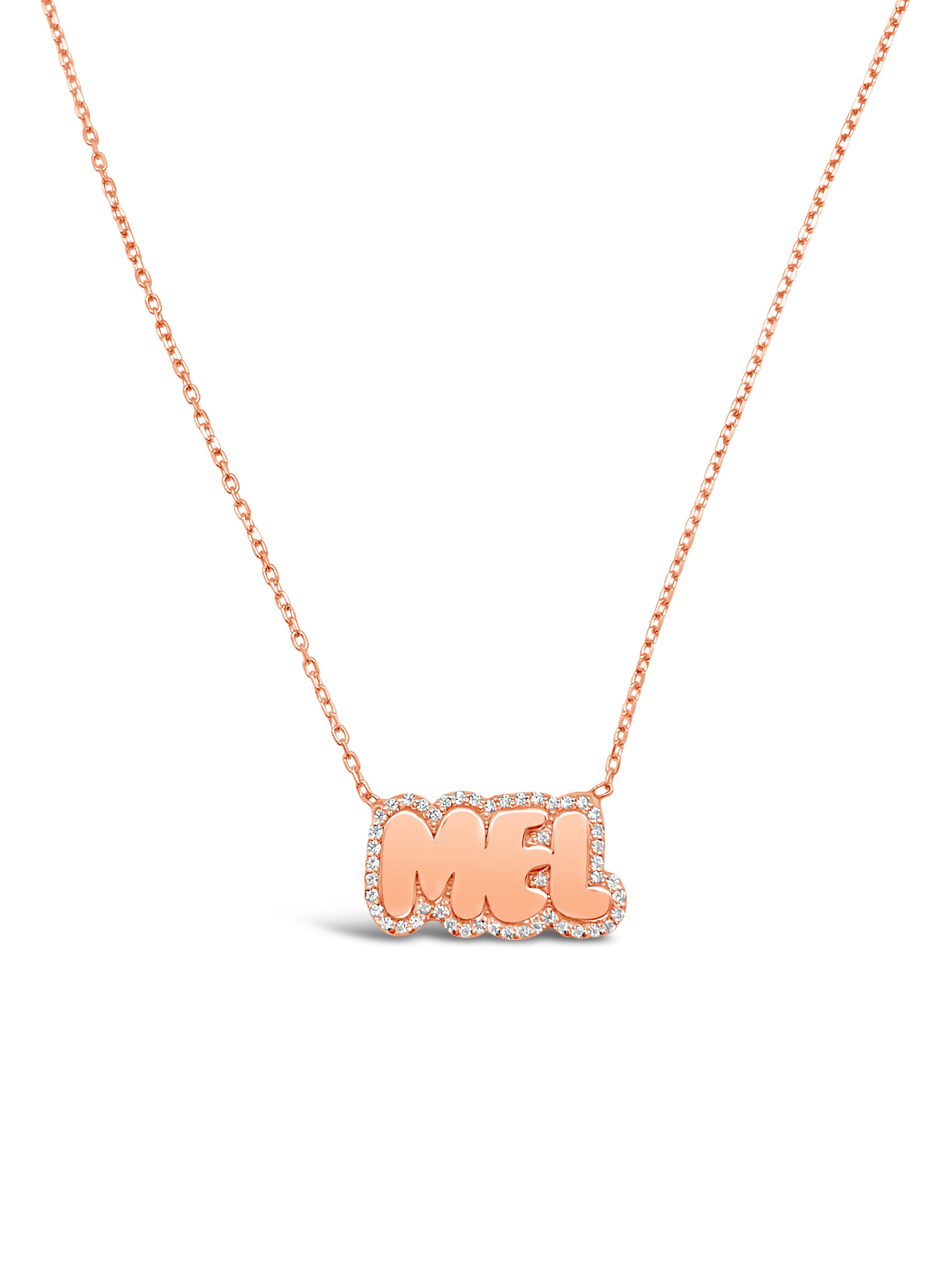 This Balloon name necklace is available to order in Sterling silver white, yellow or rose gold plated with cubic zirconia. This design can be ordered with a 16" or 18". (Letters are all capital)