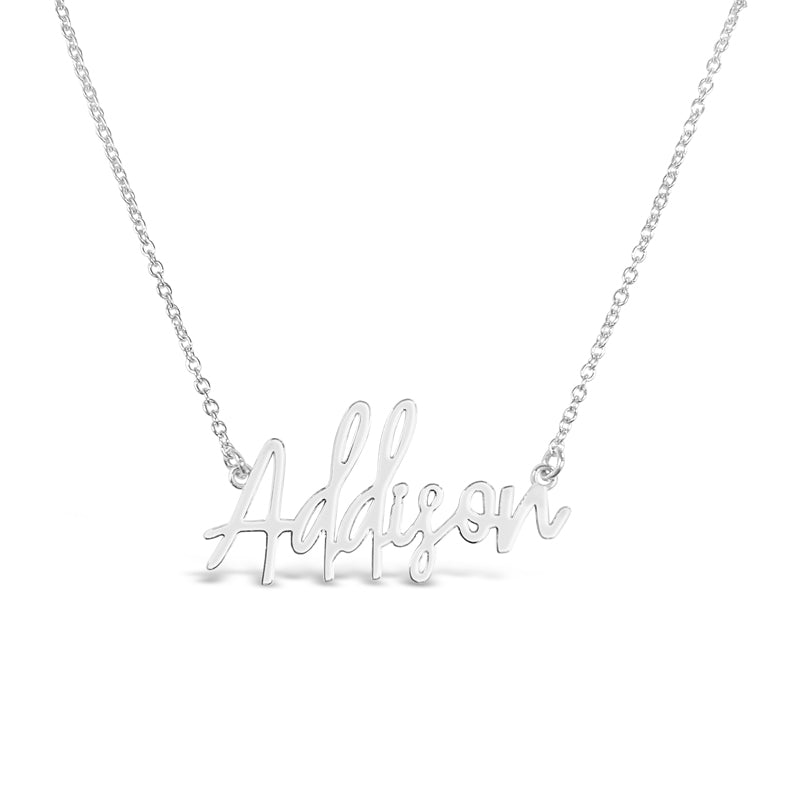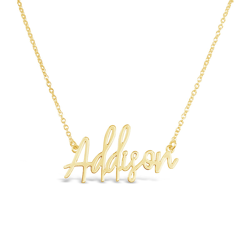 This style font has quickly become our most popular style name necklace. Name necklaces are the perfect balance of stylish and timeless, that can be worn every day. Wear your name, your kids names, your significant others etc.